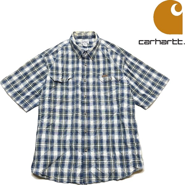1点物◆カーハートXXLビッグサイズ半袖チェックシャツ古着メンズレディースOKアメカジ90sストリートスポーツ/ワークブランド紺青水色348446