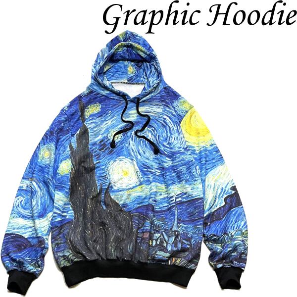 1点物◆ゴッホ星月夜アートプリント総柄スウェットパーカー古着メンズXXLレディースOKアメカジ90sストリートMixスポーツUSトレーナー348692