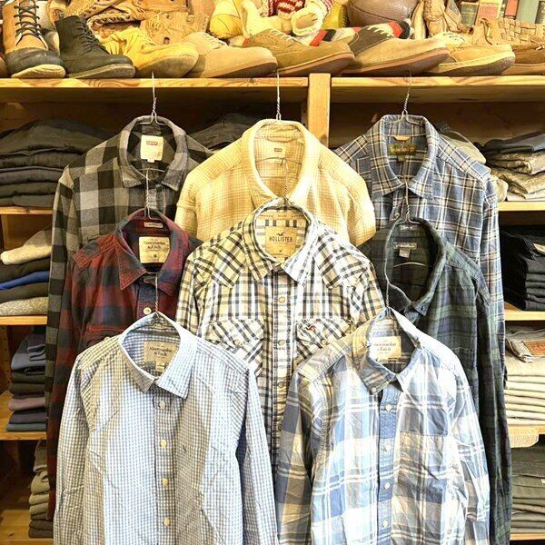 1点物◆アバクロ系ホリスター長袖チェックシャツ古着メンズMLレディースOKアメカジブランド90sストリートMixカットソー紺白シャツ348795