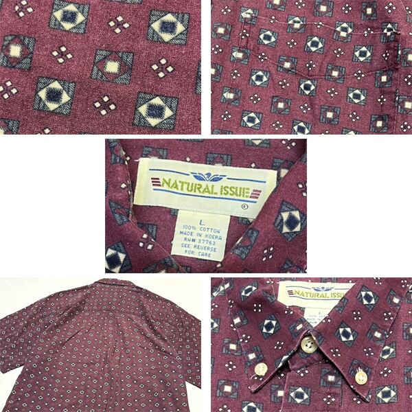 1点物◆90sビンテージ幾何学模様柄シャツ半袖アロハシャツ古着LメンズXLレディースOKアメカジ90sストリート/スポーツブランド/エンジ349386