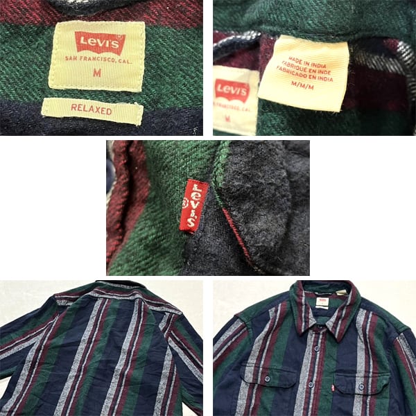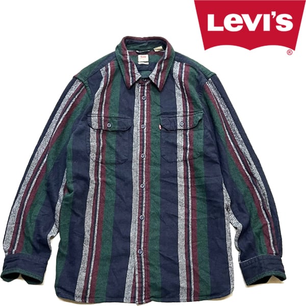 1点物◆リーバイスLevisマチ付ネルシャツ長袖ストライプシャツ古着メンズMLレディースOKアメカジ90sストリートブランド深緑エンジ紺362270