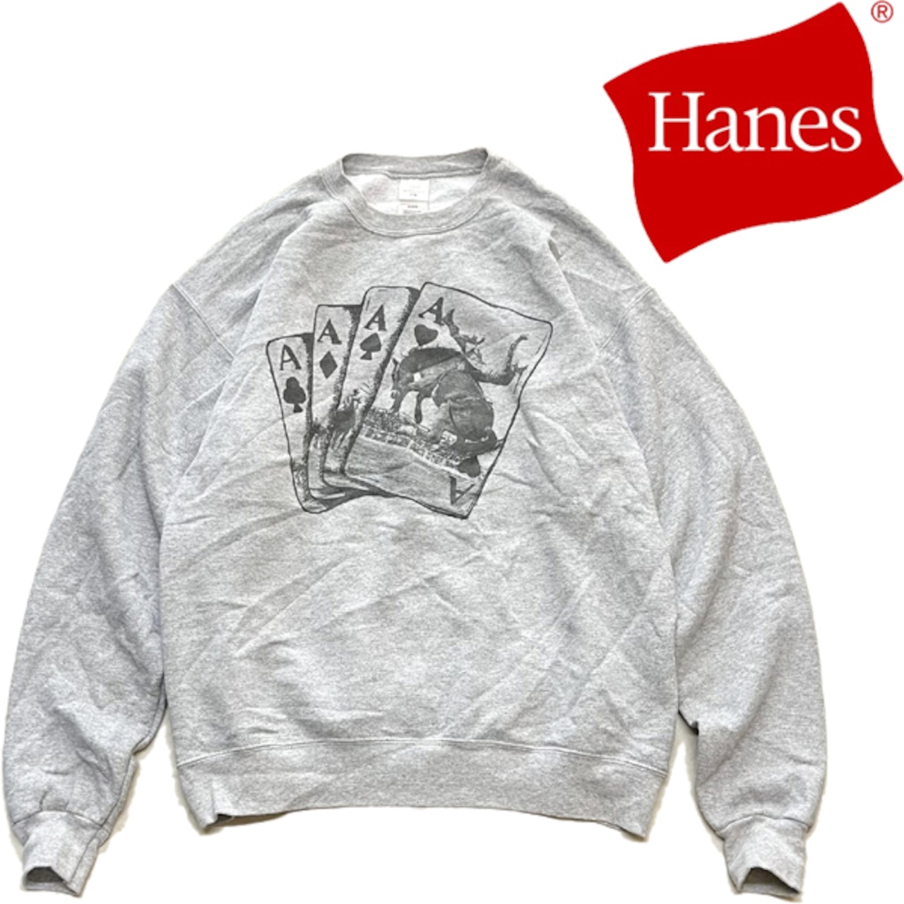 1点物◆へインズHANESトランププリントスウェット古着メンズMLレディースOKアメカジ90sストリート/スポーツUSAブランド中古グレー灰362287 | 古着屋カチカチ 東京都北区 JR王子駅前で実店舗展開中 通販もOK Tokyo Japan