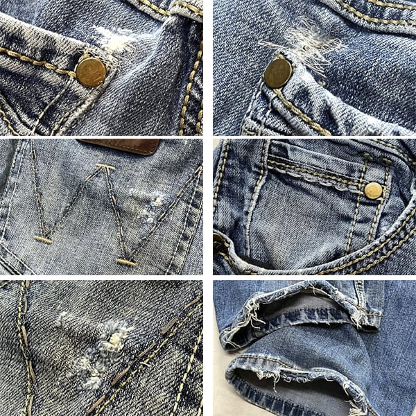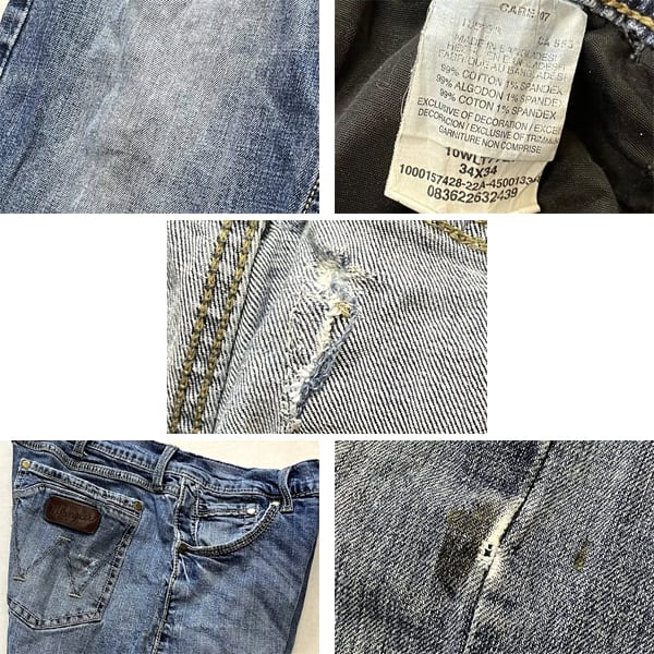中古 使用感あり (両裾にホツレ傷ダメージ、 左バックポケット付け根に補修跡、 モモに黄ばみやヨゴレ、 右バックポットにキズ小穴)。 (写真参照)