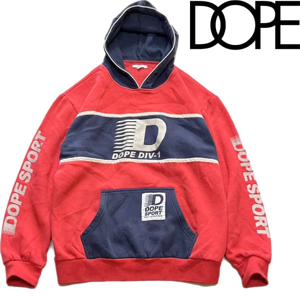 1点物◆ドープDOPE紺赤ツートン袖プリントスウェットパーカー古着LメンズXLレディース/アメカジ90sストリートUSトレーナージャケット362723 | 古着屋カチカチ 東京都北区 JR王子駅前で実店舗展開中 通販もOK Tokyo Japan