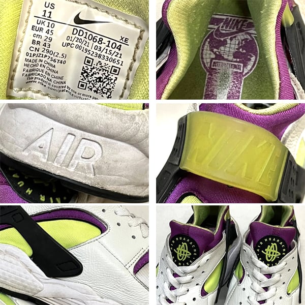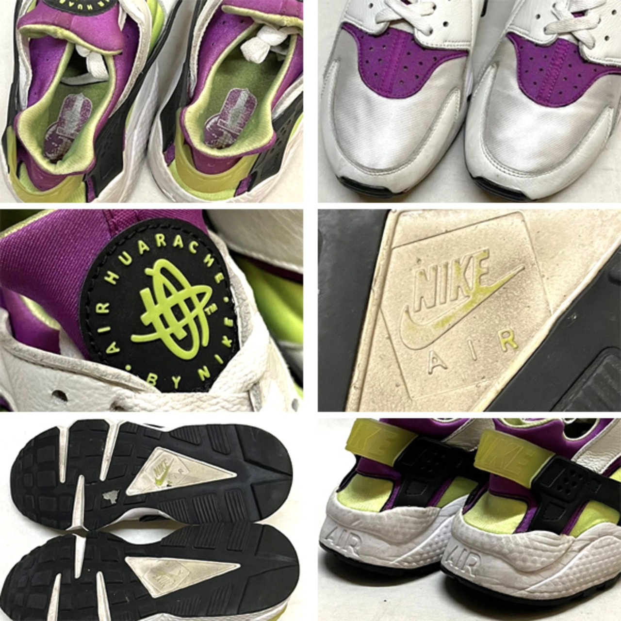 モデル名: AIR HUARACHE、 素材: 本革、 色: 白紫/蛍光緑。
