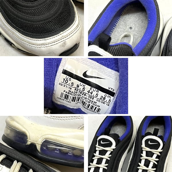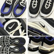 モデル名: Air Max 97、 素材: レザー/メッシュ、 色: 白黒/紫。
