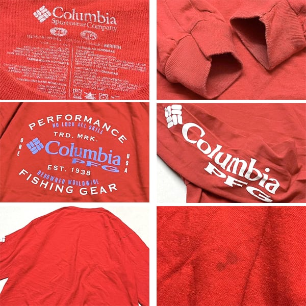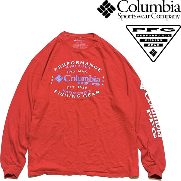 1点物◆コロンビア赤PFG袖プリント長袖ロンTシャツ古着メンズXLレディースOKアメカジ90sストリートUSブランド中古アウトドア釣り登山363216