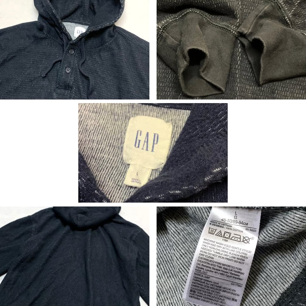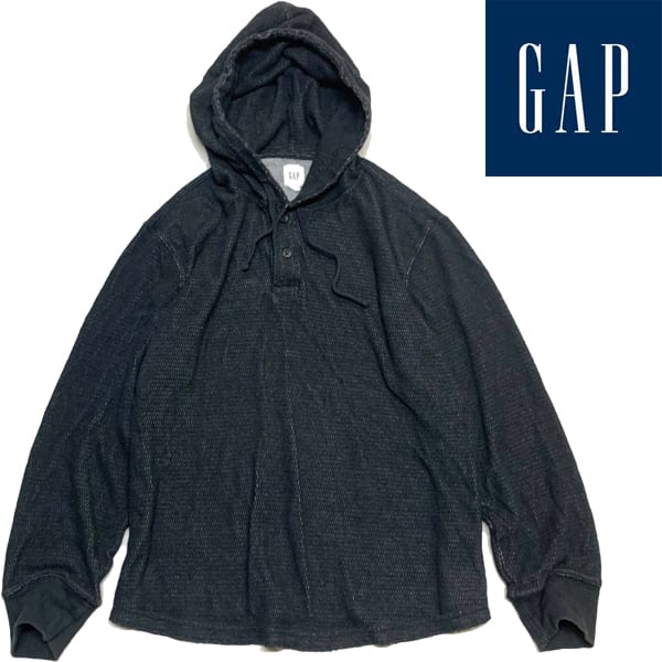 1点物◆ギャップGAP黒サーマルパーカー長袖ロンTシャツ古着メンズL/XLレディースOKアメカジ90sストリート/スポーツ/カットソー無地363477