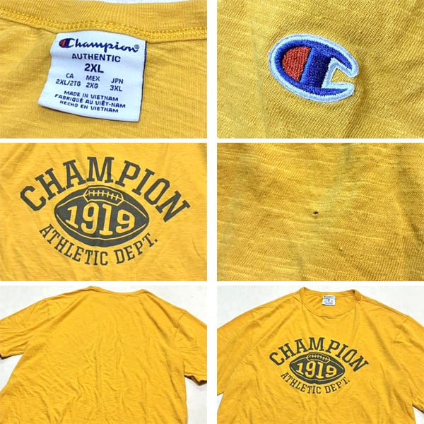 1点物◆チャンピオン黄色アメフトプリントTシャツ古着メンズXXLレディースOKアメカジ90sストリート/スポーツブランド中古Champion363761