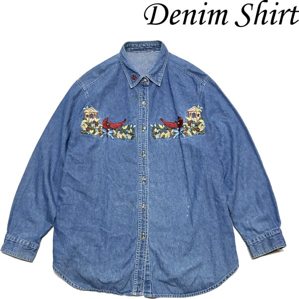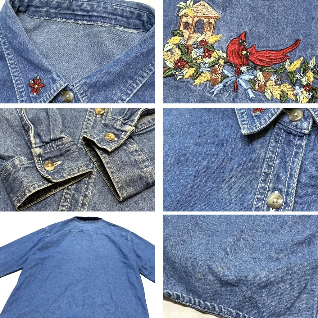 1点物◆レトロ花アニマル刺繍デザイン長袖デニムシャツ古着レディースメンズOKアメカジ90sストリート/スポーツUSAブランド鳥ブルー青363449