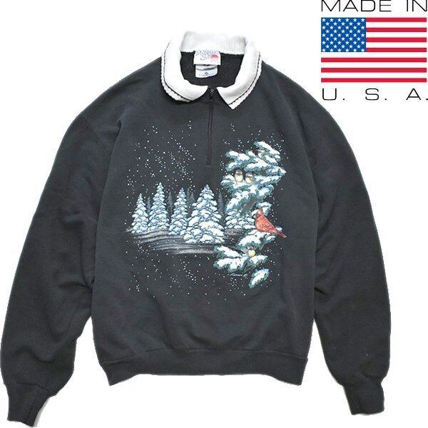 1点物◆USA製ハーフジップ襟付き和柄プリントスウェット古着メンズSMレディースOKアメカジ/ストリート/スポーツMixトレーナー黒/動物992732
