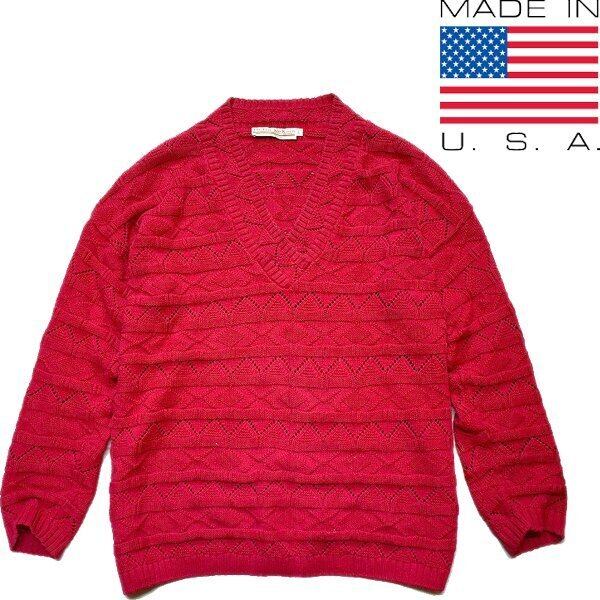 1点物◆USA製コットンニットセーターVネック古着レディース3XLメンズOKアメカジ90sストリート/スポーツMixくすみ色えんじ柄デザイン785194