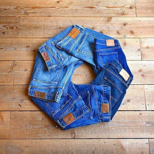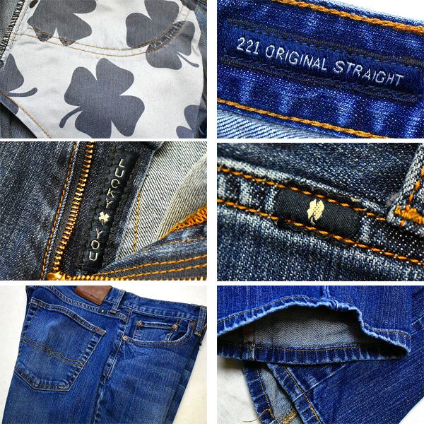 縦落ち仕様のビンテージウッシュ加工デニム、 4つ葉のクローバージップ。