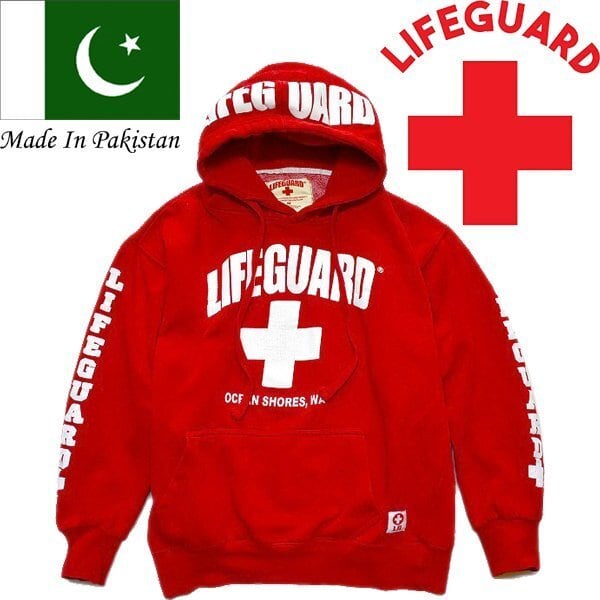 1点物◆パキスタン製ライフガード赤プリントスウェットパーカー古着メンズSMレディースOKアメカジ90sストリート/スポーツ/トレーナー785947