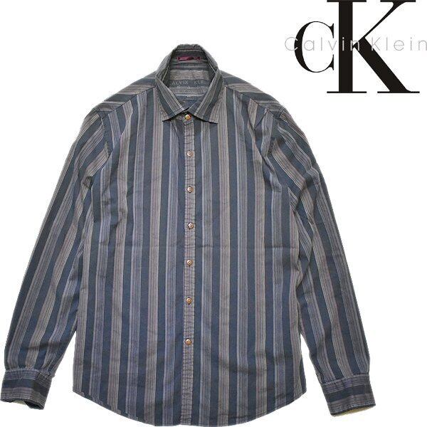 1点物◆カルバンクラインCK長袖ストライプシャツ古着メンズMLレディースOKアメカジブランド90sストリート/スポーツ柄シャツ黒茶/中古557857