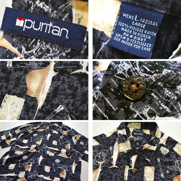 1点物◆カジキ鮪レーヨンハワイアンシャツ黒アロハシャツ古着メンズLレディースOKアメカジ90sストリート/スポーツ/ブランド柄シャツ558779