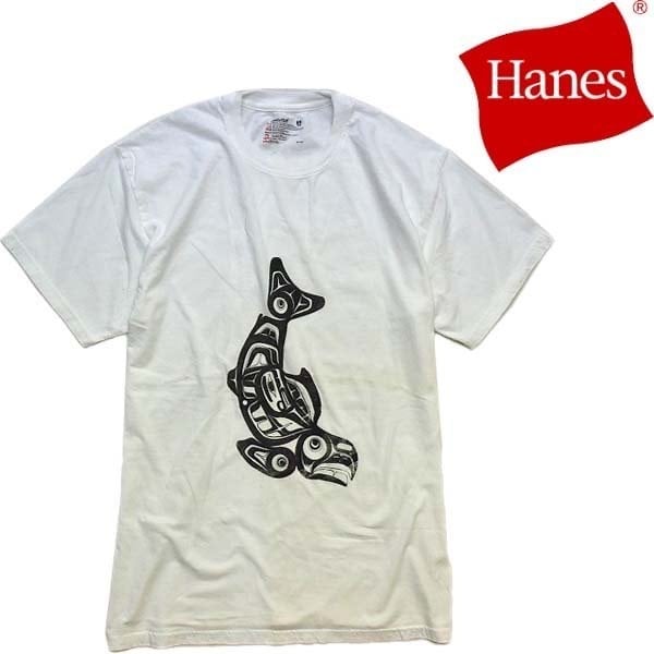 1点物◆ヘインズHanes魚柄プリント白Tシャツ古着メンズMLレディースOKアメカジブランド90sストリート/スポーツ/ビッグサイズ/レトロ558982