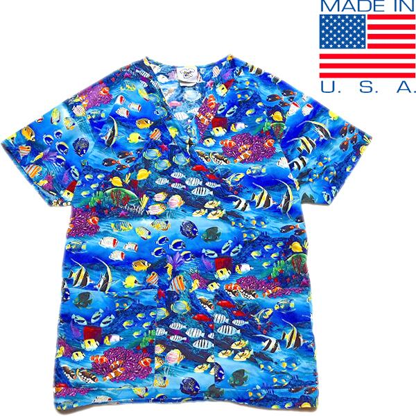 1点物◆USA製プルオーバーシャツ熱帯魚スクラブシャツ古着メンズレディースOKアメカジ90sストリート/スポーツMixワークブランド中古559068