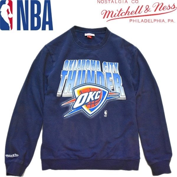 1点物◆ミッチェルアンドネスNBA紺プリントスウェット古着メンズMLレディースOKアメカジ90sストリート/スポーツ/トレーナー/ネイビー370754