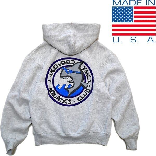 1点物◆USA製バックプリントJERZEESスウェットパーカー古着メンズMレディースOKアメカジ90sストリート/スポーツ/トレーナー/グレー370846