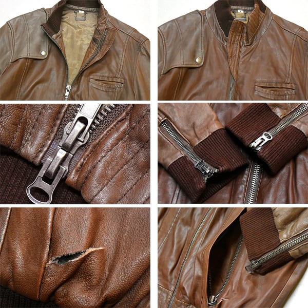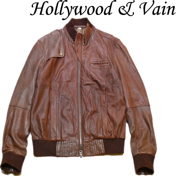 1点物◆Hollywood & Vain茶レザージャケット革ジャン古着メンズLレディースOKアメカジ90sストリート/スポーツXLブルゾン銃ガンパッチ371433
