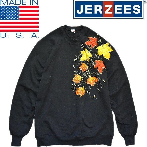 1点物◆ビンテージUSA製もみじ金ラメ黒スウェット古着メンズLレディースOKアメカジ90sストリート/スポーツ/アメリカ製トレーナー丸首371871