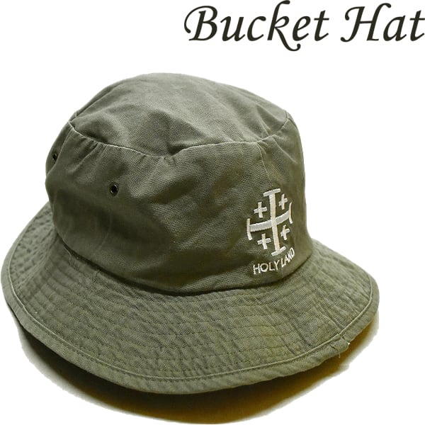 1点物◆HOLY LANDオリーブ色ロゴ刺繍バケットハット帽子/古着メンズレディースOKアメカジ90sストリート/スポーツ/クロッシェ/レトロ372173