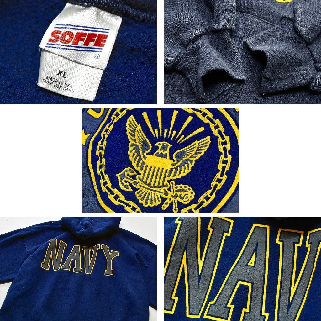 1点物◆USA製アメリカ軍SOFFEバックプリント紺スウェットパーカー古着メンズ2XLレディースOKアメカジ90sストリートNAVYトレーナー372227
