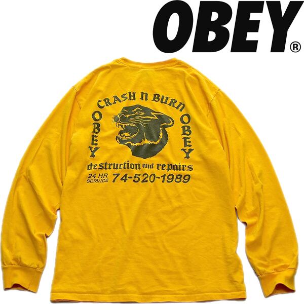 1点物◆オベイOBEY黄色バックプリント長袖ロンTシャツ古着メンズMLレディースOKアメカジブランド90sストリートMixスポーツ/スケート372406