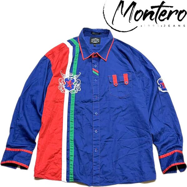 1点物◆刺繍ロゴ長袖モンテロジーンズ赤青白シャツ古着メンズXXXLレディースOKアメカジブランド90sストリート/スポーツMixブランド372884