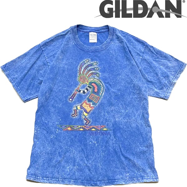 1点物◆アシッドウォッシュ青インディアンプリントTシャツ古着メンズレディースOKアメカジ90sストリート/スポーツブランドポロシャツ372969