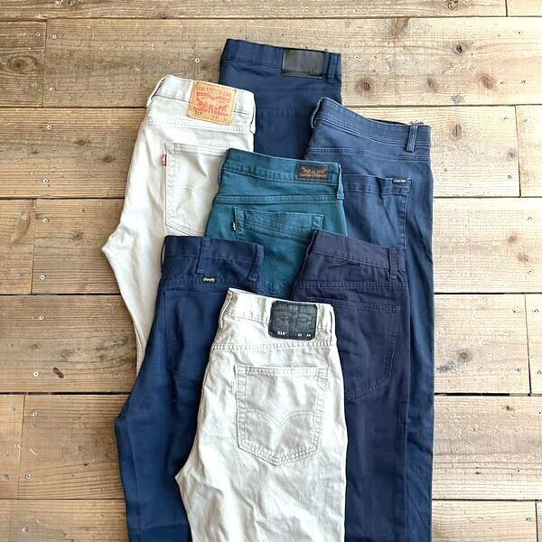 形: スリムストレート、 素材: 100%コットン、 色: 紺。