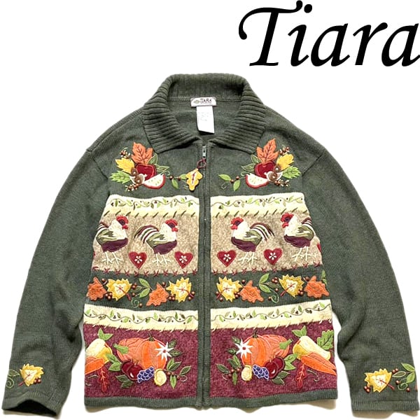 1点物◆ティアラTIARA個性派刺繍ニットセーターカーディガン古着メンズレディースOKアメカジ90sストリート/スポーツ中古カウチン緑272638