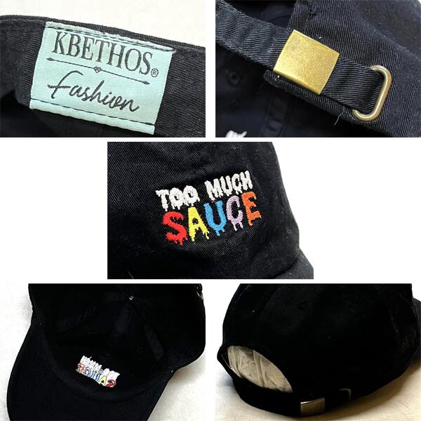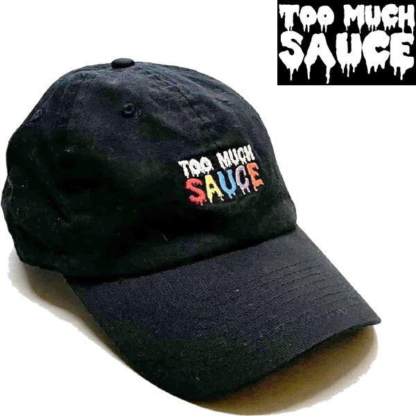 1点物◆TOO MUCH SAUCEロゴ黒キャップ帽子US古着メンズレディースOKアメカジブランド90sストリート/スポーツ中古ベースボール/ハット348229